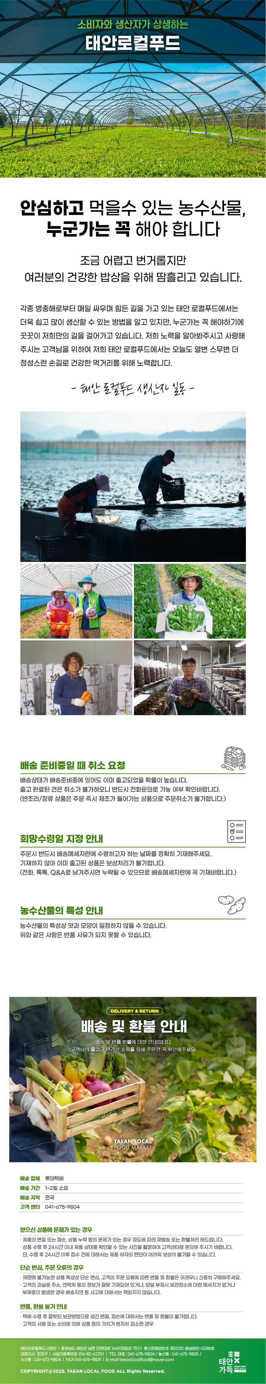 태안군로컬푸드사업단 ㅣ 충청남도 태안군 남면 안면대로 1641(당암리 751) ㅣ 대표이사 조민구 ㅣ 사업자등록번호 316-82-62251 ㅣ 통신판매업번호 제2020-충남태안-0288 ㅣ 이메일 taeanlocalfood@naver.com