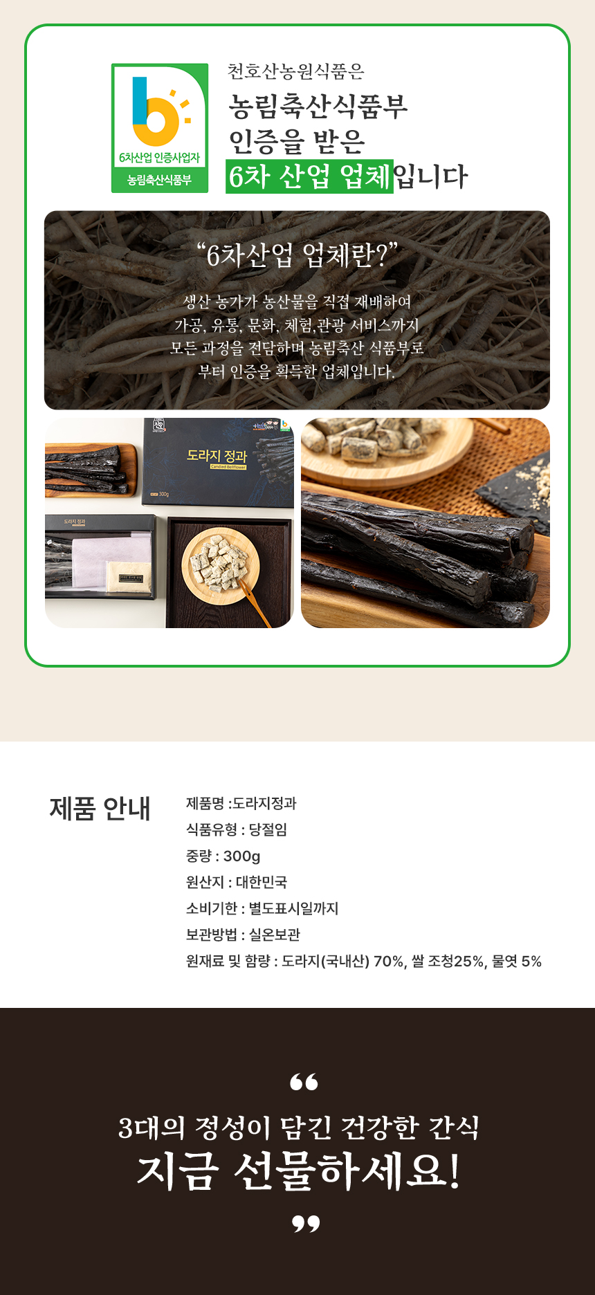 3대째 이어온 정성으로 360시간 저온 숙성한 수제 도라지정과. 직접 키운 국내산 도라지로 건강한 달콤함을 담았습니다.
